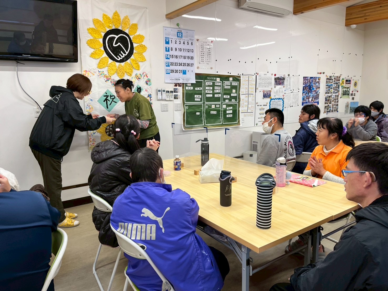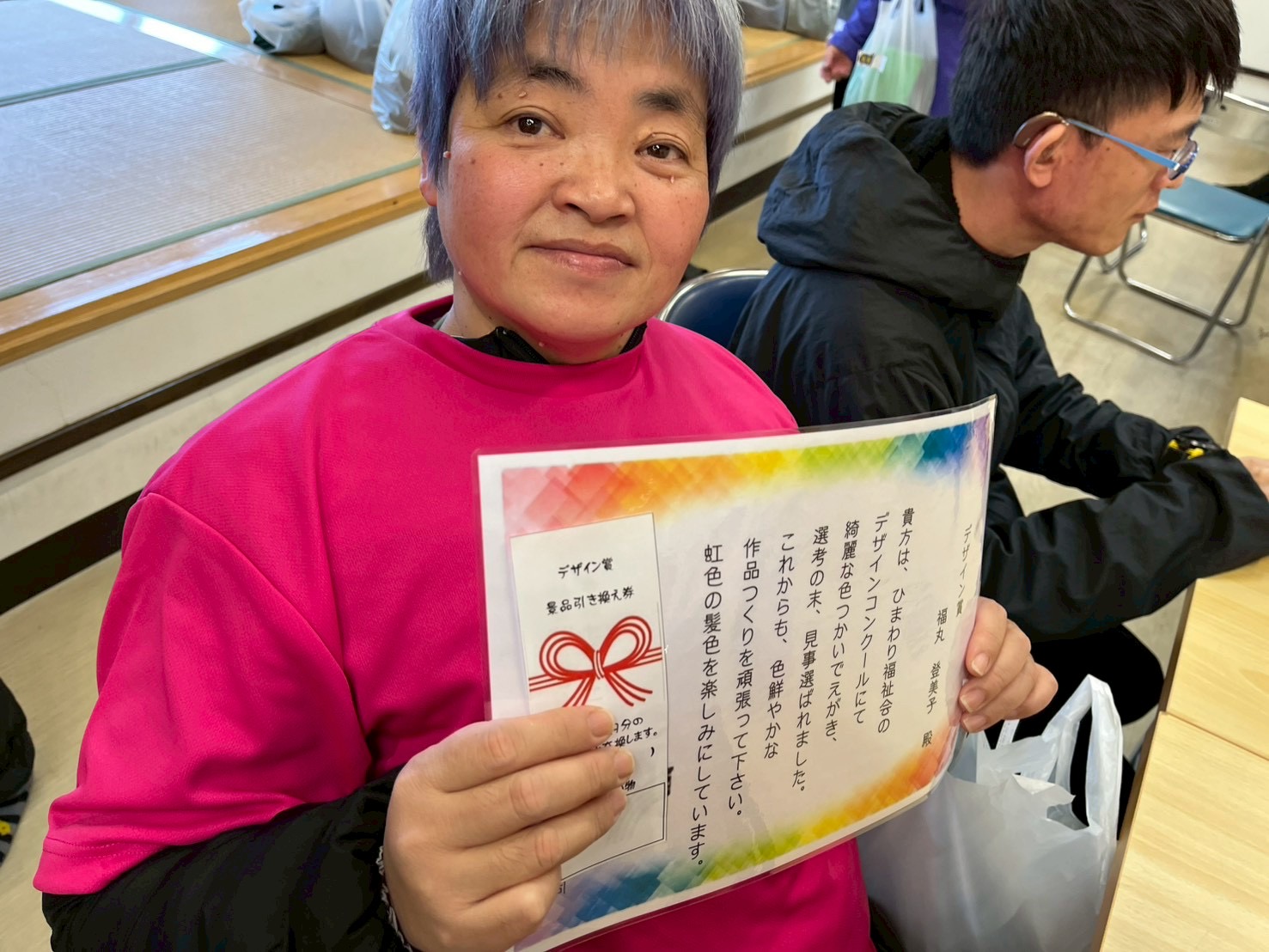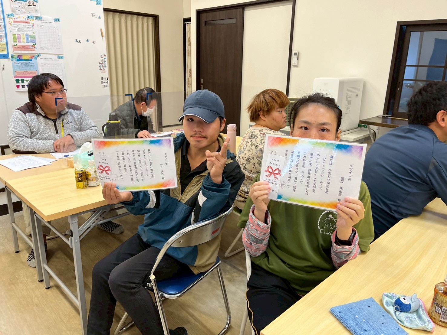 法人ポロシャツのデザインを新しくするにあたり、仲間・保護者・職員でデザインコンクールを開催し沢山の応募の中、選考の末、選ばれた方々へ賞状と副賞の授与式を行いました。また、